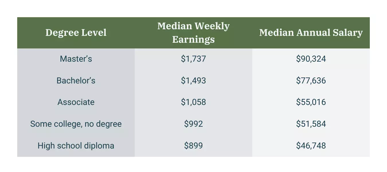 According to a 2023 BLS report, degree holders with master's degrees or higher earn more after receiving the next highest degree level. Graduates with a master’s degree had median weekly earnings of for bachelor’s degree graduates.