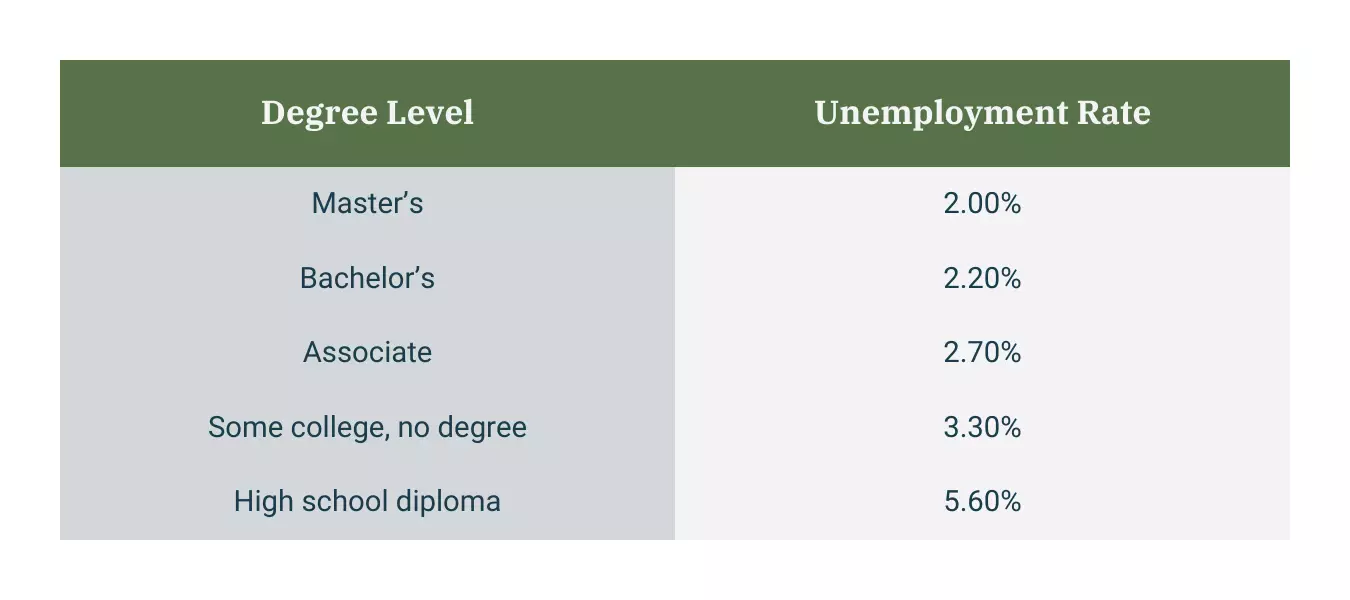 While there's no guarantee that anyone is safe in their current role, furthering skills and knowledge helps someone establish their credibility and expertise – therefore improving their value to the organization. This earns greater job security in the process. Just think about the unemployment rate chart above. There's a reason why graduate degree holders experienced the least amount of unemployment.